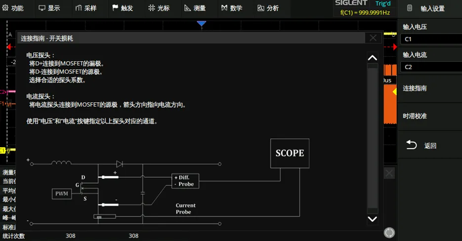 其中每一项测试在示波器中均有详细的连接指南和连接提示图,以开关损耗为例,相关的连接说明如图7所示,在说明中提示了探测点的选取,探测设备的选择以及正确的探测方向和配置方法。