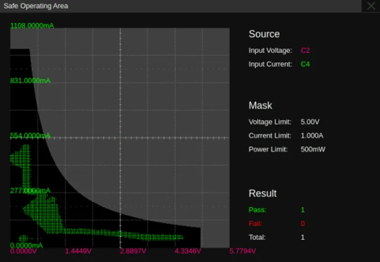 电源分析功能中的安全工作区(SOA)可以根据配置菜单中设置的电压限制、电流限制和功率限制参数自动生成,并判断MOSFET上的应力是否超出SOA,有助于设计者快速发现电路中的问题或潜在风险。