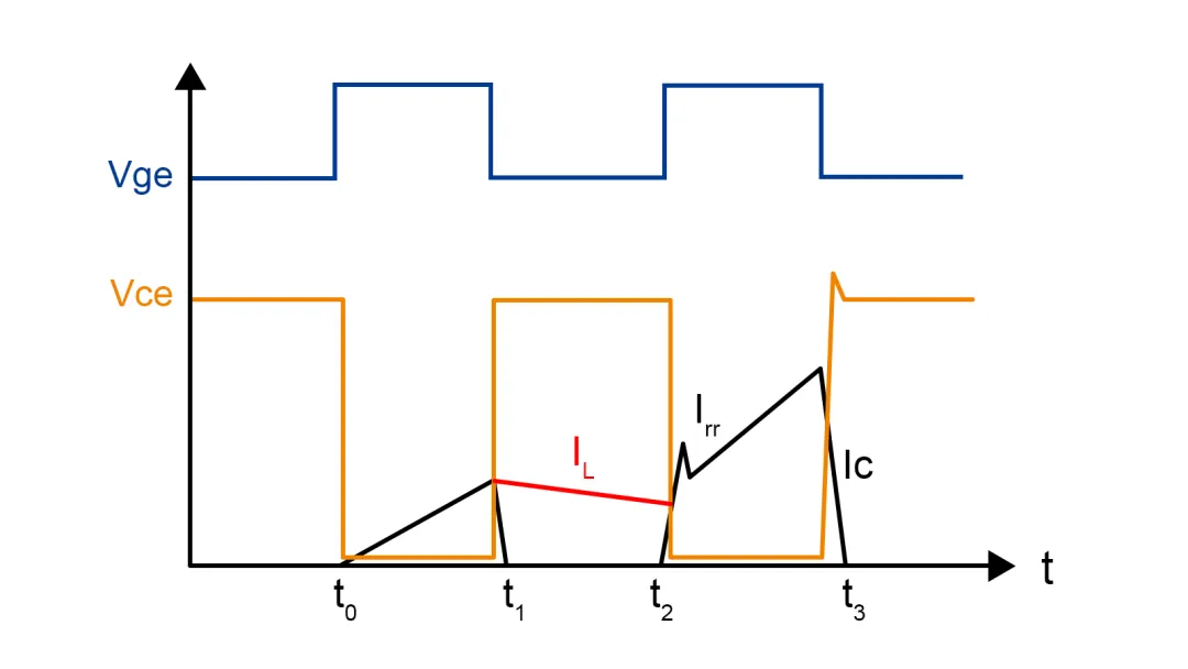 图2的蓝色波形为门极发送的双脉冲波形,绿色波形为下管两端的电压Vce,黑色的波形是测试到的下管集电极电流Ic。