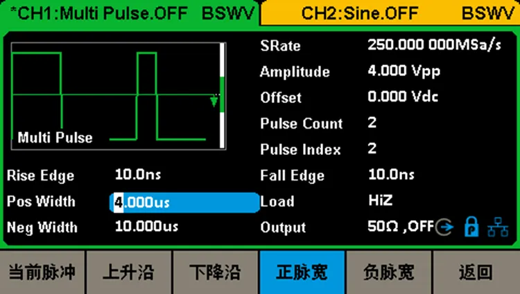 不仅如此,工程师在多脉冲界面中可以选择脉冲的数量和幅度,并且可以针对每个脉冲设置相关的上升下降沿时间和正负脉宽的宽度,界面简洁,操作逻辑清晰。