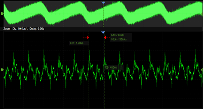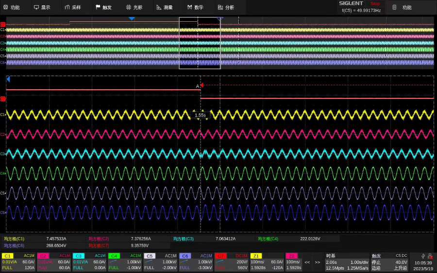 ● 三相交流电分析,三相交流电广泛应用于需要高能效或大功率的机电设备,如三相逆变器、电机、驱动器等。逆变器广泛应用于家电、太阳能光伏发电、风能发电等,而在诸多汽车系统中,主驱、水泵、油箱冷却系统都是由三相电所控制,对这些设备进行功率分析和电能质量测量必不可少。使用SDS6000 Pro分析三相电时,其中3路接高压差分探头测量电压,3路接电流探头测量电流,这样不仅能直接观测到实时波形,还能利用数学运算进行各种信号处理得到电流有效值、视在功率、波峰因数、谐波失真等参数。