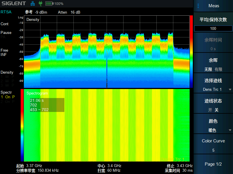 SHA860A 实时分析带宽最大 110 MHz,能以100% POI 捕获最短 3.51 µs 的信号。RTSA 模式下,分析仪能在实时分析带宽之内无缝地进行FFT计算和频谱触发,十分有利于瞬态信号的捕获,分析信号频率、信号特征、持续时长、幅度变化等。在频谱监测、跳频电台测试、振荡器研发等领域有着广泛的应用。