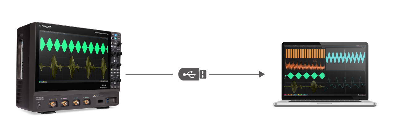 从示波器设备中导出二进制波形文件,然后通过 U 盘或网络服务器放到电脑硬盘即可将波形数据导入至SigScopeLab中,而后进行波形分析,如测量运算、解码、模板测试、分析门限等,强大的计算分析工具为您提供深层次的数据挖掘与分析。