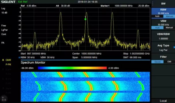 SVA1000X同样也将高级功率测量功能作为选件,支持测试信号邻道功率比、占用带宽等,并可通过瀑布图监测频率变化的输入信号,用色温反映其幅度大小(即功率大小),助力用户全方位分析待测信号。