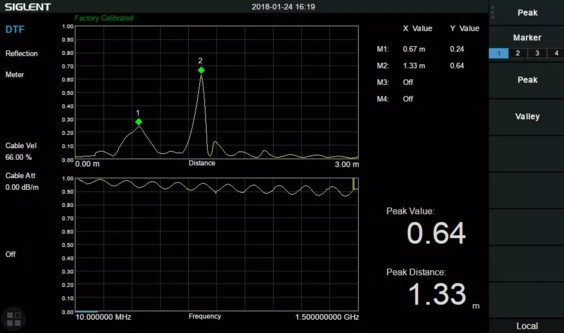 该功能主要用于天线和电缆的性能验证和故障分析。利用标配的TG和DTF(Distance to Fault)选件,可以精确测量回波损耗和VSWR与距离的关系,并迅速识别连接不良,线缆损坏或故障并定位其位置。屏幕上的数据一目了然,使得用户能够准确找到故障点,更快排除故障并及时修复。