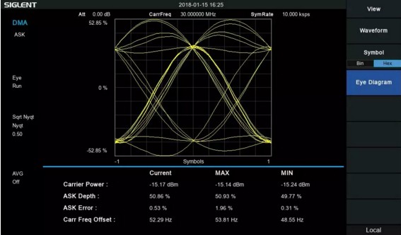 作为常用的数字调制方式,ASK和FSK在信息传输中应用广泛。SVA1000X系列频谱&矢量网络分析仪选配ASK/FSK数字调制分析功能,可对对应的调制信号进行分析,并可以波形、符号(包含二进制和十六进制)、眼图三种形式显示出分析结果。载波功率、调制深度以及频率偏移等参数也在屏幕下方清晰的显示出来。同时,利用眼图可以定性地分析码间串扰和噪声,获取传输系统性能的相关信息。