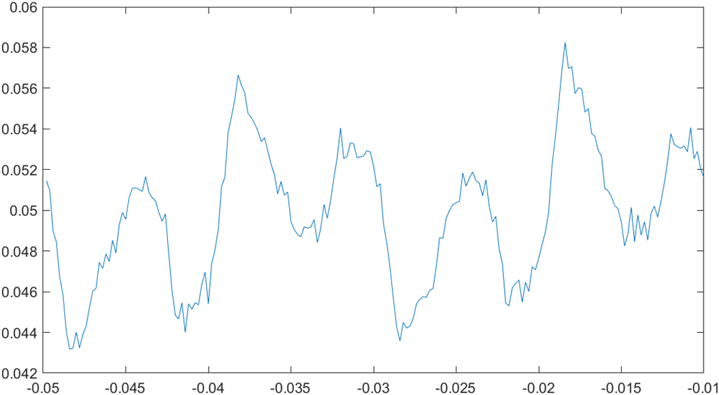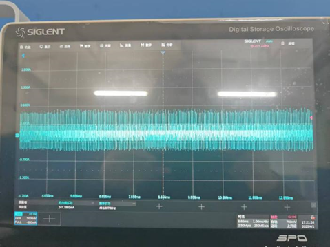可以看到波形已经只剩下低频分量,发生了非常大的畸变,产生的波形已经不符合原来22kHz基频变化的结果。此时进行rms均方根计算得到结果为 0.0500A,此时比较对应客户在使用电源进行采集的结果,测试出来的值已经发生了变化,并不能代表真实的电流值了。
