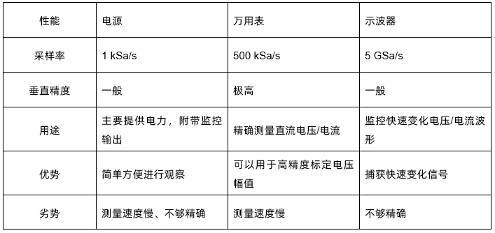 在测试工作中,基于不同信号需要使用不同的仪器进行测试。低频率波形、接近直流的信号可以采用万用表进行精度较高的测定;高频率变化、起伏较大的信号可以采用示波器进行快递测定。使用不同仪器互补测量,确保信号得到完整的表征。
