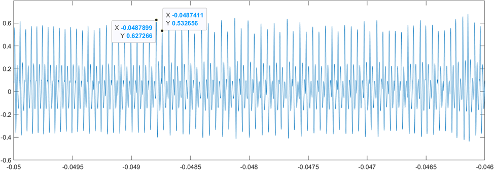 通过对数据进行50倍降采样,达到基波的奈奎斯特采样率,并对同等4ms时间取200pts进行观察,如下图: