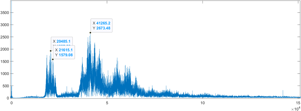 初步可以看到波形细节上大致是一个基于 44μs 为周期的波形信号,对应其频率为22.5kHz。为了更精确处理波形的频率分量,采用FFT变换后得到以下电流波形频谱数据: