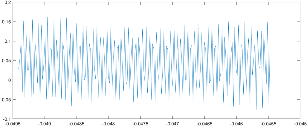 可以看到基波保留,但是相应的高频分量已经丢失,整体的波形细节已经发生了丢失,同时峰值幅度也较之前大幅偏小。此时进行rms均方根计算得到结果为 0.0865 A,可以看到此时结果已经发生了较大的变化,采样率的降低已经影响到测量结果的准确性。