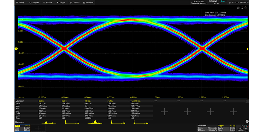 As the core of signal integrity analysis of high-speed systems, eye diagrams characterize high speed communication signals. The quality of the system can be evaluated by observing the influence of inter-symbol crosstalk, noise, and bandwidth. Jitter analysis characterizes the statistical distribution of small timing changes in a systems and is often used to debug digital communication systems and high-speed signal transmission. The SDS7000A series supports automatic parameter measurements for jitter and eye characterization. Easy setup and automatic measurements speed debugging and simplify engineering design testing.