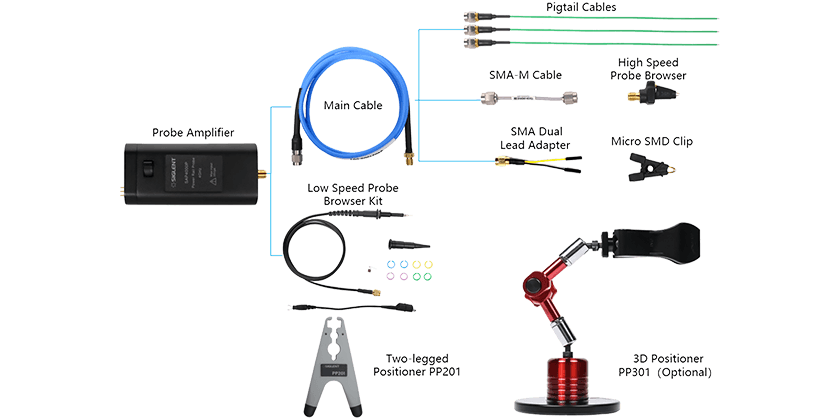 对于工程师来说,经常需要验证多个电源轨信号,由于组件尺寸较小以及间距紧凑,连接示波器与被测点较为复杂且耗时, 因此SAP4000P电源轨探头提供的多个配件,如双公头SMA线缆、高频点测探头、微型SMD夹子等,可灵活设置多种连接方式,极大满足了不同应用场景的使用需求。