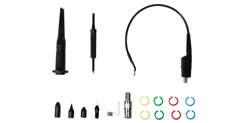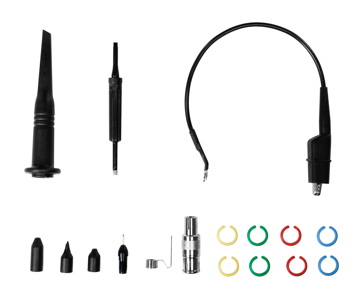 有源探头配件包,适用于SAP2500D。包含刚性探针*5, 弹性探针*5, 可旋转探针*2,保护器*2,Y形测试线缆*2,5厘米接地线*1,6厘米接地线*1,12厘米接地线*1,短弹性接地针*2,长弹性接地针*2,可焊接测试线*2,排针*2,标识色环*8。