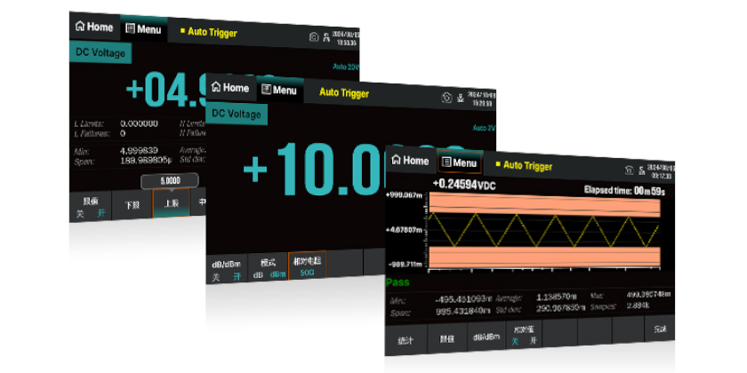 SDM4055A系列支持最大值、最小值、平均值、标准差,dB/ dBm,限值等运算。不仅能快速统计各种测量数据,还能根据预设的上下限值执行通过/失败测试。此外,其支持功率单位显示,能以dB为单位展示测量值与参考值的相对关系;通过相对运算功能,还可精确地找出实际测量值与预期值间的差异