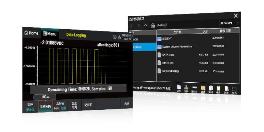 SDM4055A支持数据记录间隔 0.1s ~ 3600 s,最大可记录到内存 2 M 点,最大可记录到文件 360 M 点,最长可记录 100 小时。此外,其具有出色的存储与调用能力,可在内部存储区和外部USB存储设备上轻松管理仪器参数文件。512 MB RAM存储器、256 MB Nand-Flash,支持读数点,图片,csv/xml等多种类型文件存储,用户可创建文件夹、保存屏幕截图、复制、重命名和删除文件等操作,高效进行数据管理