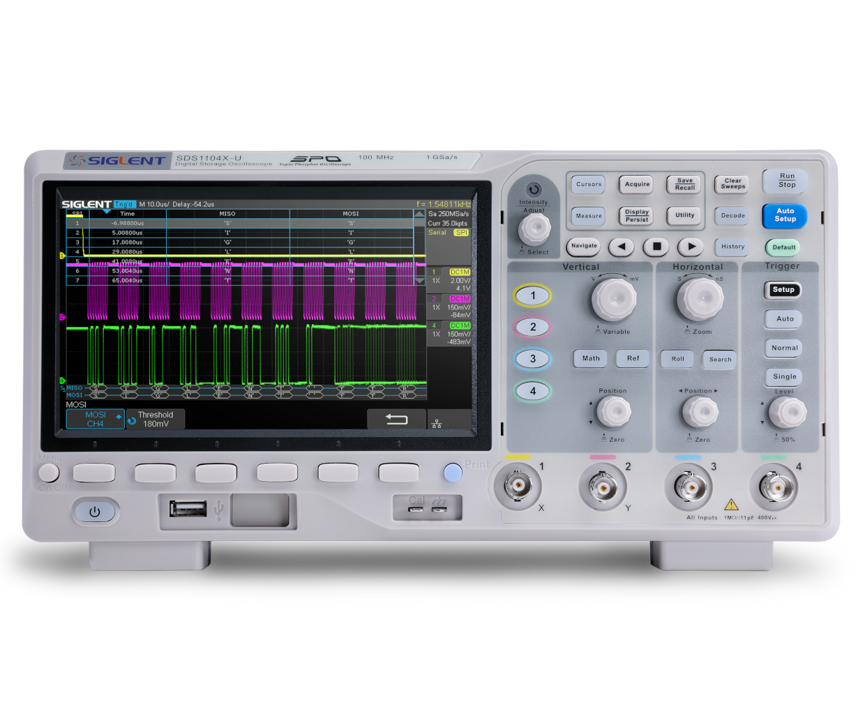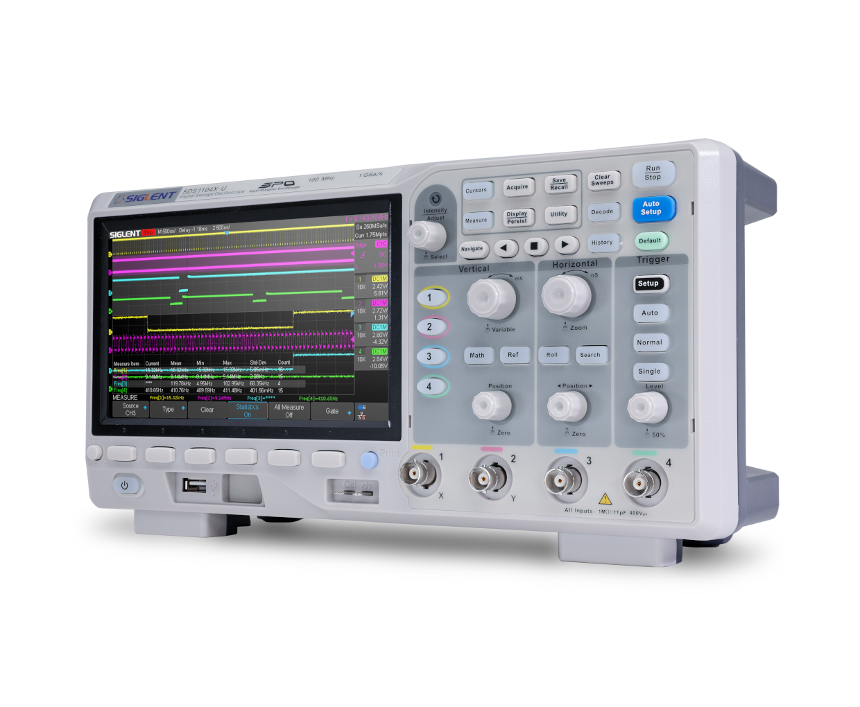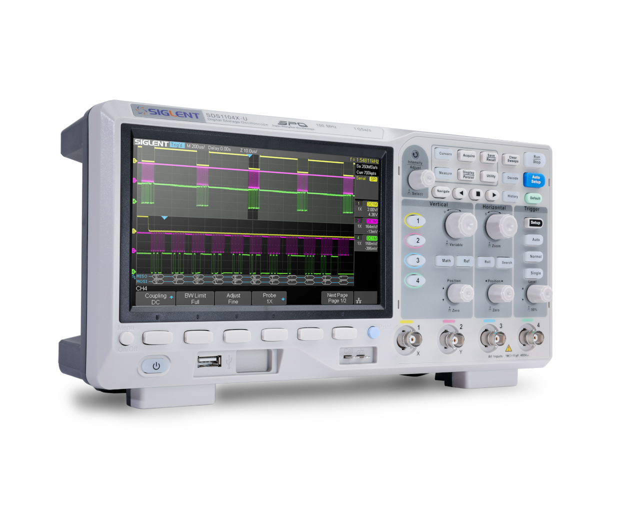 SDS1104X-U系列以其四通道设计和高性能指标脱颖而出。100 MHz的带宽,1 GSa/s的采样率和14 Mpts/ch的存储深度,确保在多通道测试中的准确性和稳定性。是电子设计、生产和教育领域的优选工具。