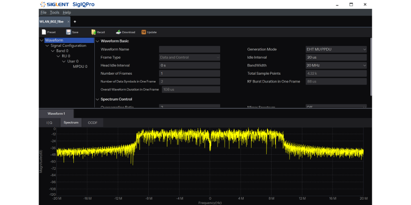 • 严格遵循IEEE 802.11b/a/g/n/ac/ax/be标准,生成高精度参考信号,并经过严格的验证和性能优化