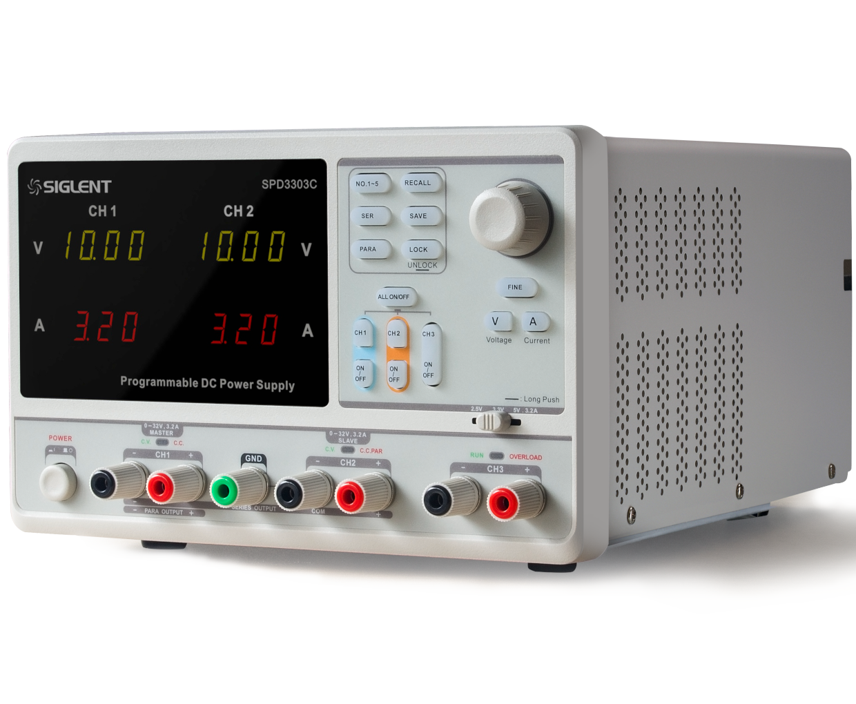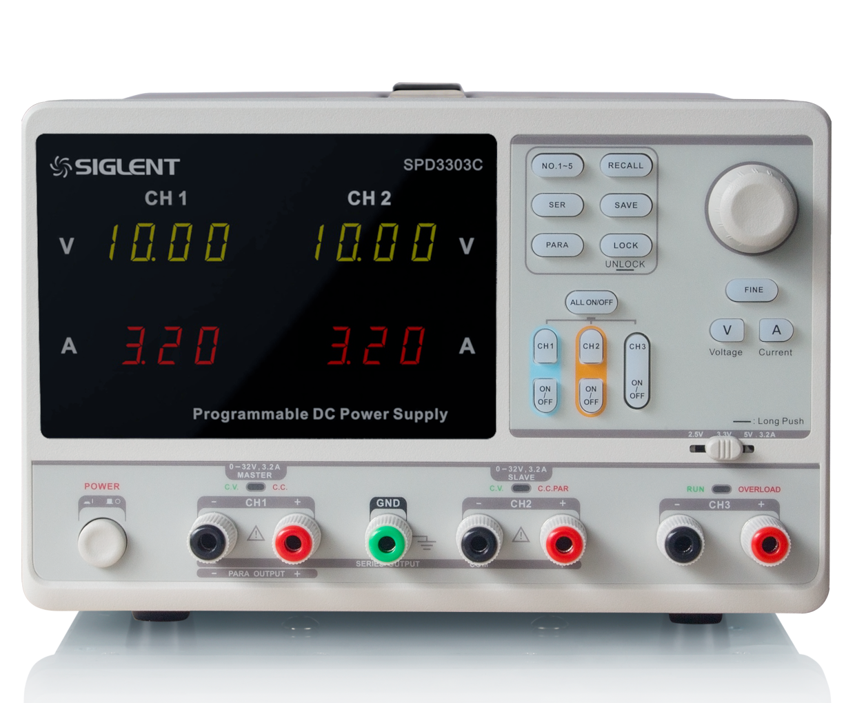 - 三路高精度电源独立可控输出:CH1:32 V/3.2 A,CH2:32 V/3.2 A,CH3:2.5 V/3.3 V/5 V/3 A