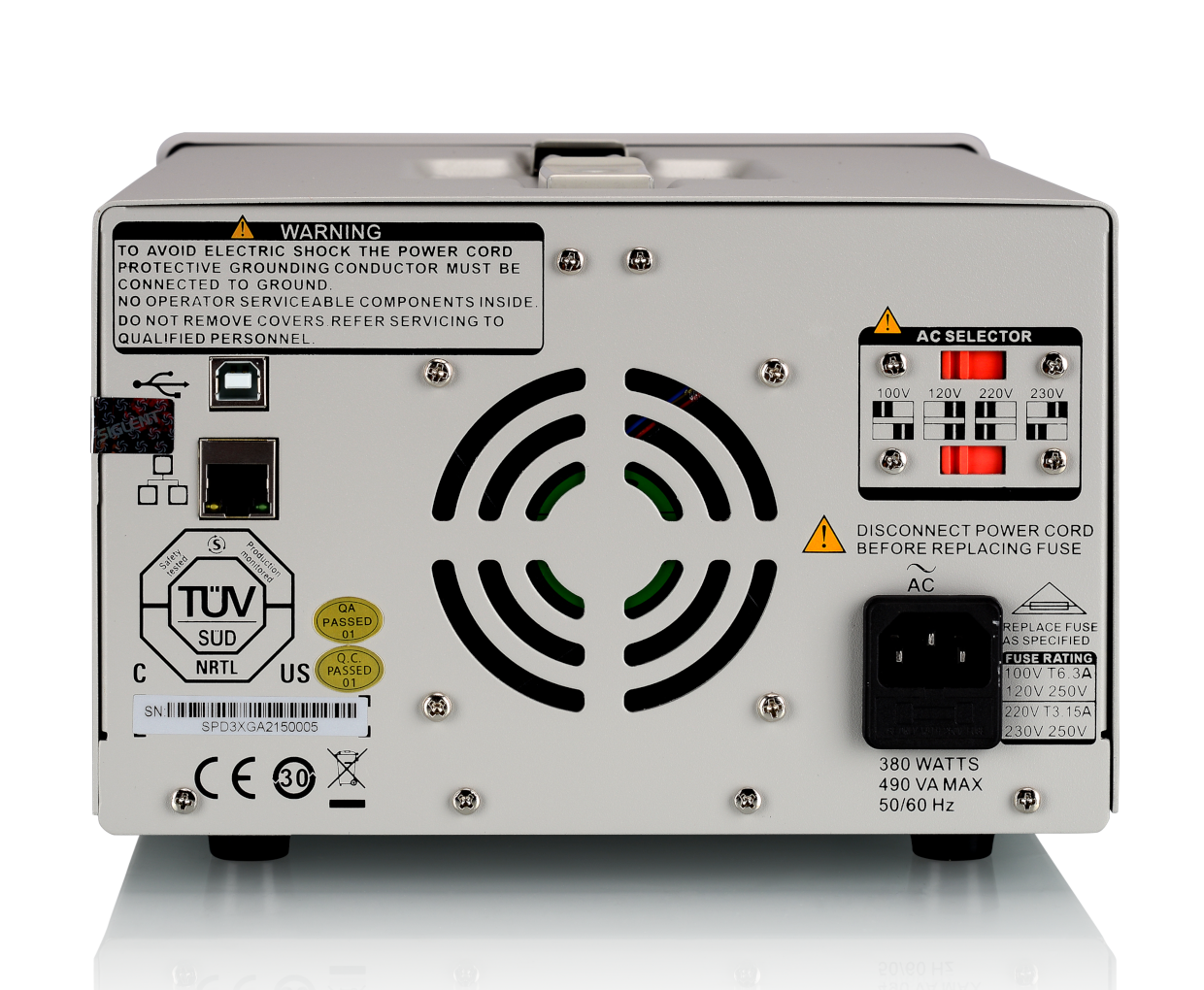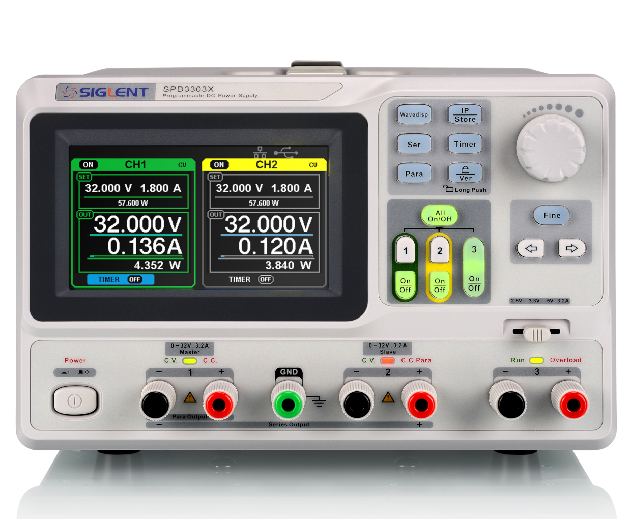 SPD3303X/X-E/X-C系列可编程线性直流电源总功率220 W,三路高精度电源独立可控输出,5位电压和4位电流显示,最小分辨率为1 mV,1 mA。性能强劲、稳定,即使非常小的电压或电流变化,也能够准确模拟,完全满足负载的供电要求。