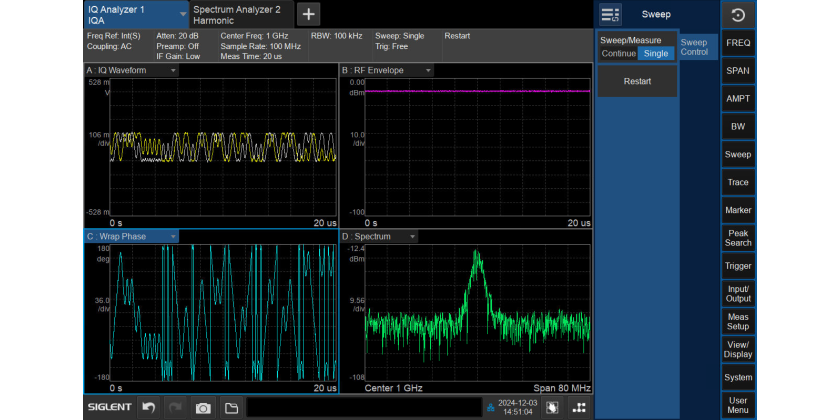 SSA6000A系列作为优米网官方下载苹果版旗舰信号分析仪,支持2 Hz~50 GHz的频谱分析,IQ分析带宽高达1.2 GHz。内置高稳参考时钟源,扫频采用YIG微波预选器,具有优良的动态范围,可满足大部分射频微波测量需求