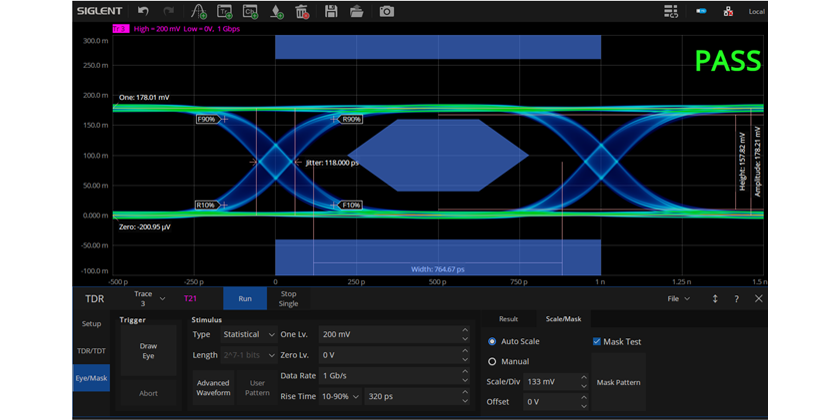 时域分析功能可精确测量传输线的特征阻抗并帮助定位断点或短路点的具体位置,提供了许多处理备选方案如时域变换、窗口、耦合、标记和门控。此外增强时域分析功能TDR还可通过内部仿真生成眼图,无需额外的码型发生器,即可高效完成波形一致性测试。利用眼图功能可以更直观地分析信号传输中的噪声、抖动、码间串扰等问题。TDR 功能可广泛应用于 PCB 板阻抗测试,材料性能测试,传输线质量测试中。