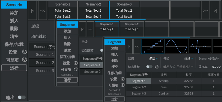 不仅如此,该系列提供强大的多层级波形序列播放功能,包括:Segment、Sequence、Scenario,仪器内置196种任意波形,涵盖数学、工程、医疗电子、调制等领域,用户可根据需求直接调用或自定义编辑波形文件,从而快速适应各种测试任务。
