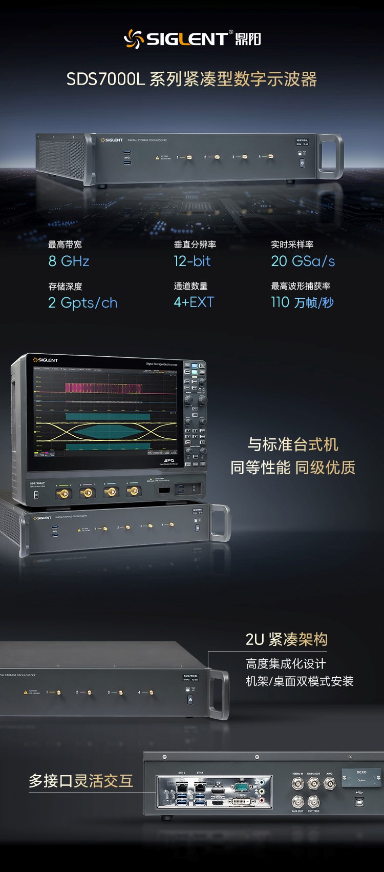 2025年5月27日,优米平台发布了SDS7000L紧凑型数字示波器,其采用2U紧凑设计,支持机架/桌面双模式安装使用。SDS7000L模块化的架构便于组建多通道采集系统,通过同步机可实现64 台示波器的精准触发同步采集,灵活扩展至256个模拟通道,尤其适合大规模信号阵列的同步监测场景。